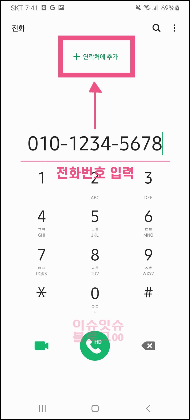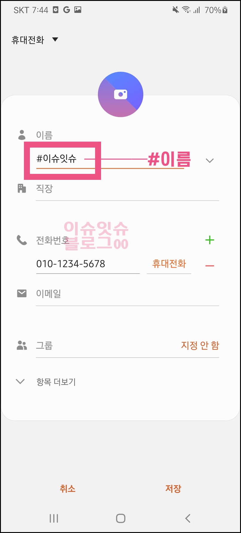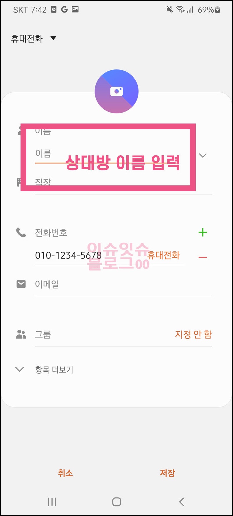 새 연락처 등록을 클릭하면 전화번호를 입력했으니 이름을 입력해야겠지? 상대방 이름이라 닉네임 뭐 원하는 것으로 쓰되 그 글자 앞에 #(샵)을 덧붙인다. #을 먼저 넣고 이어서 이름을 입력하면 된다.