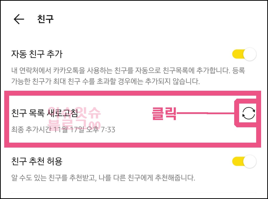더보기 > 설정 > 친구 순으로 이동을 하면 <친구 목록 새로고침> 이라는 문구가 보일것이다. 옆에 있는 새로고침 화살표를 한번 클릭 해준다.