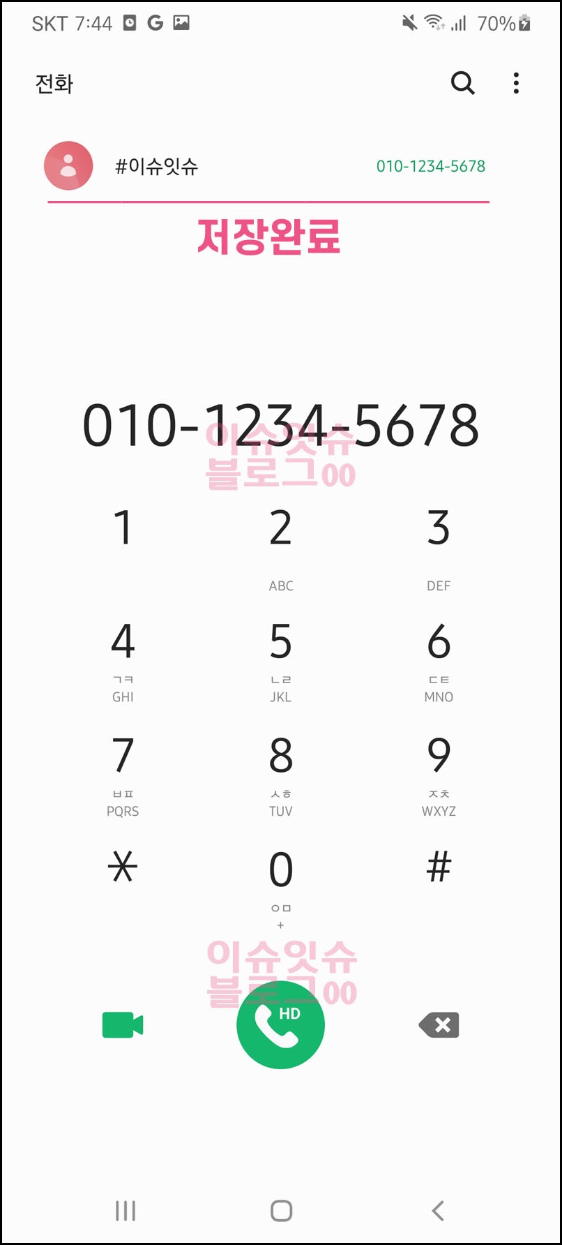 글로 설명 이해가 안된다면 위에 있는 사진을 보고 따라 하시라. <#이름>을 입력했다면 하단에 저장버튼을 클릭하여 저장을 하자. 저장완료된 화면을 확인 해보면 #이름과 함께 전화번호가 저장된 것을 볼 수 있다.