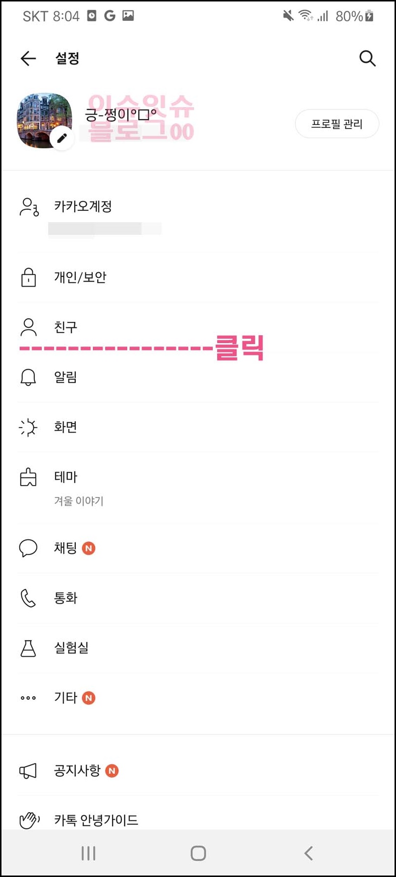 다음 설정화면에서 나의 기본정보가 보일것이고 <친구>를 클릭한다. 여기서 어떤 설정을 on/off 하느냐에 따라서 친구추가가 달라진다.