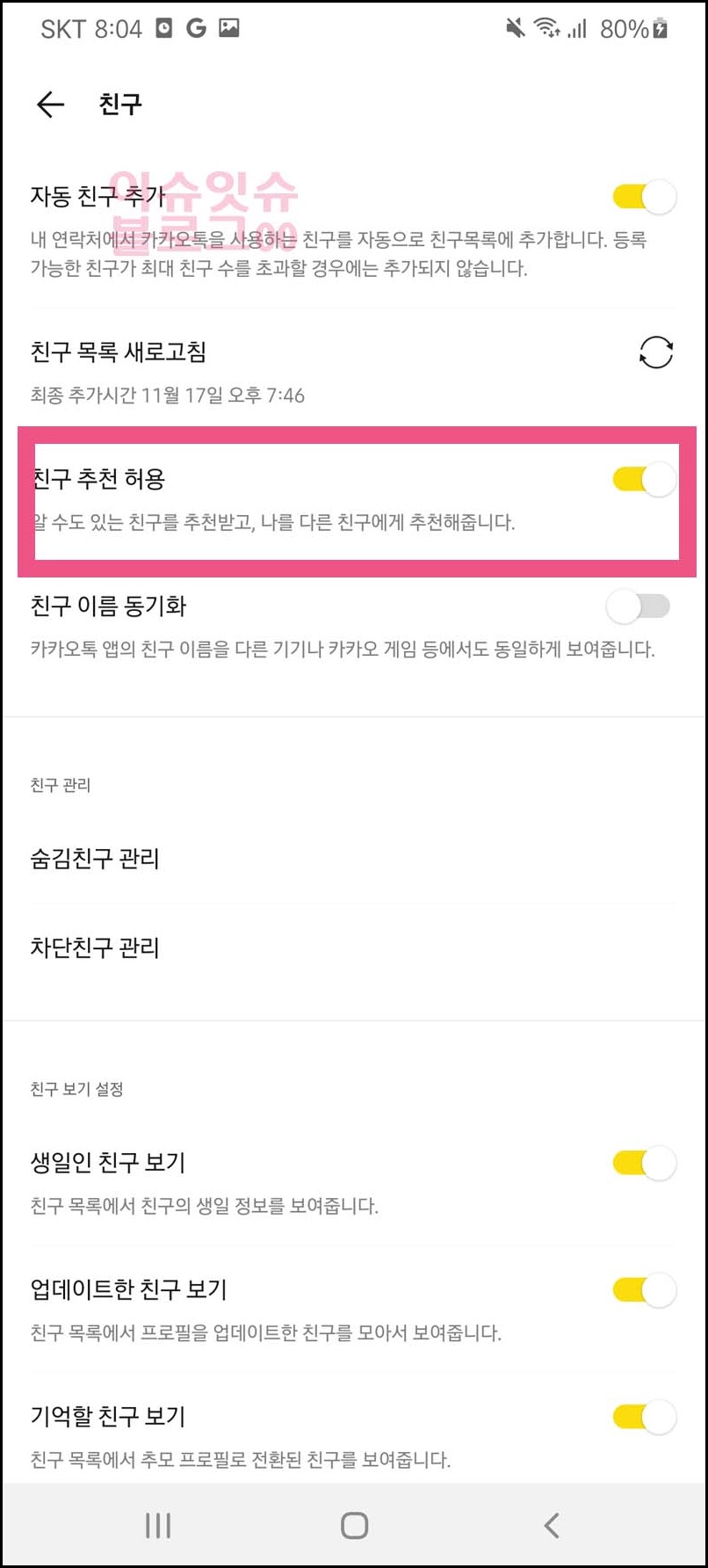 카카오톡 친구추가 안뜨게 전화번호 저장하는 방법