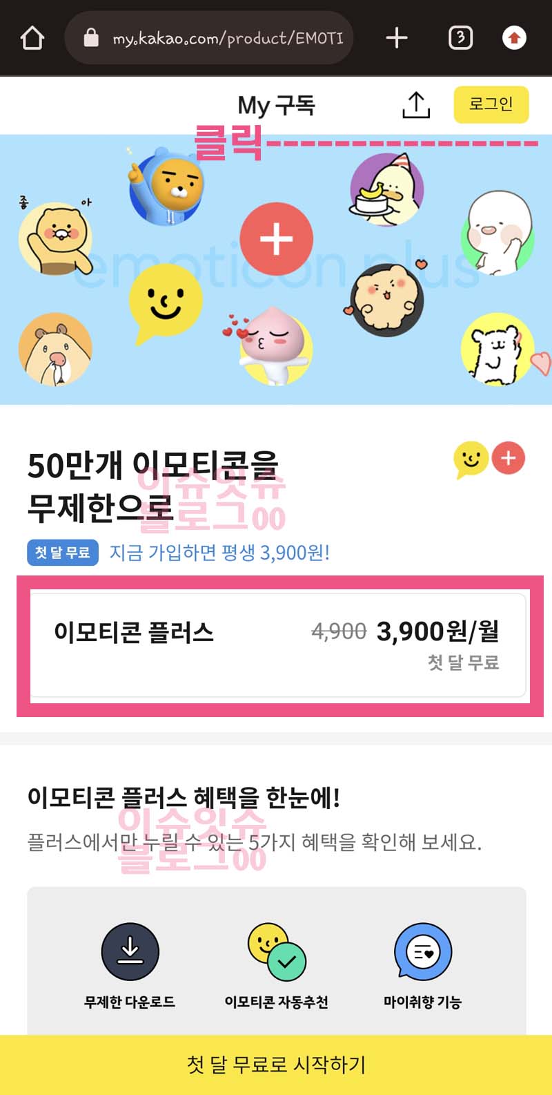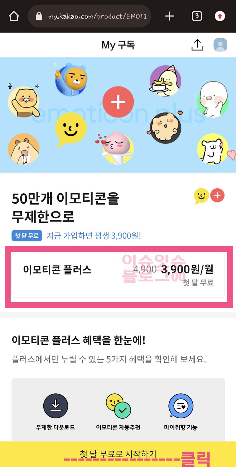 화면에서 노란 버튼을 보면 "첫 달 무료로 시작하기" 문구가 보일 것이다. 짐작한대로 카카오톡 이모티콘 플러스를 구독(구매) 하면 첫달은 무료로 체험할 수 있다. 한달무료체험인 것이다.