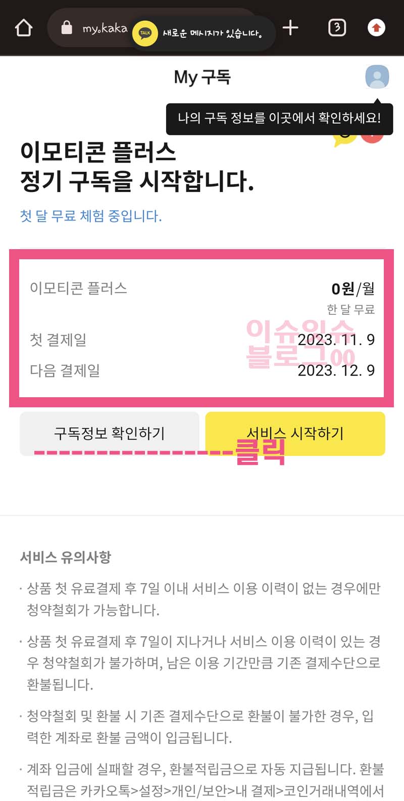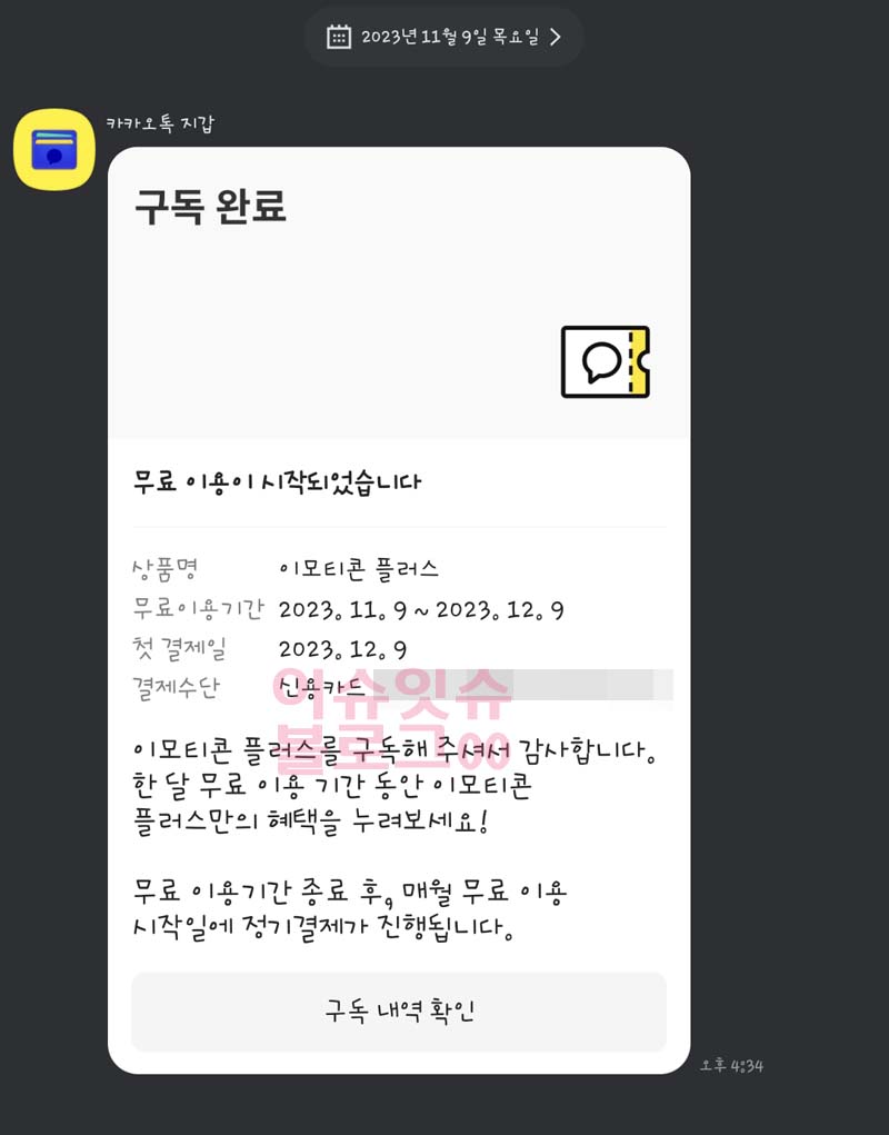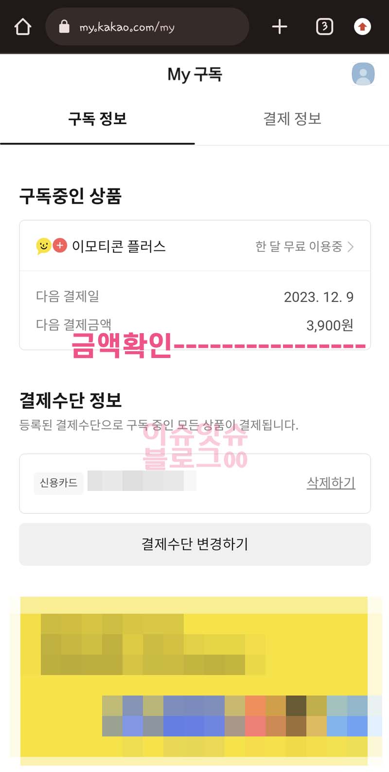 기본적으로 휴대폰으로 카드나 휴대폰 결제 하는 방법을 알면 그대로 순차적으로 하면 된다. 그러면 위에서처럼 이모티콘 플러스 정기 구독을 시작합니다. 라는 문구와 함께 또다시 친절하게도 첫결제일과 다음 결제일 날짜를 알려준다.