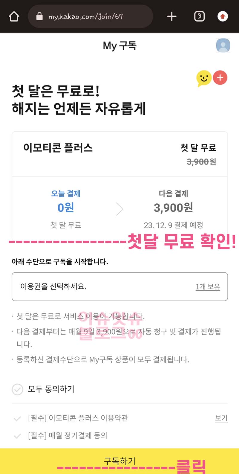 그러면 첫달 무료인것이 확인될 것이고 다음달 3,900원이 언제 결제 예정인지 친절하게도 날짜를 알려준다. 필수 동의사항 "모두 동의하기" 체크 하고 "구독하기" 클릭한다.