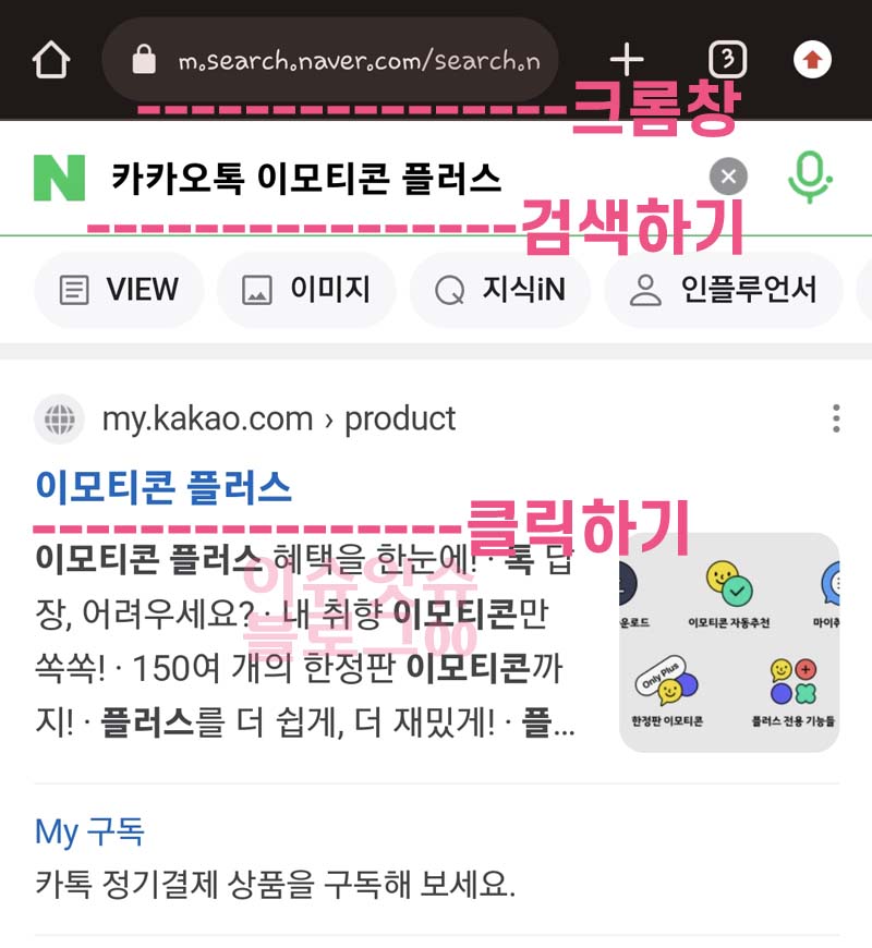 어떤 브라우저를 접속했던간에 포털사이트에서 "카카오톡 이모티콘" , "카카오톡 이모티콘 플러스", 이모티콘 플러스" 등 검색을 한다. 그러면 아래처럼 사이트가 나온다. 일단 클릭한다.
