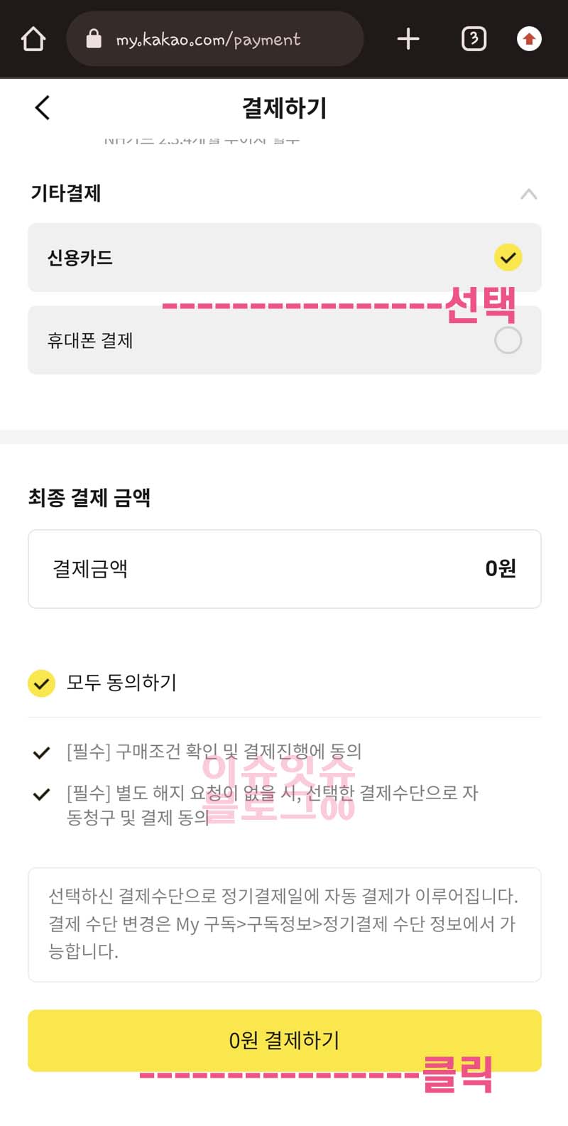 카카오페이 연결 해놓지 않은 사용자는 기타결제 > 신용카드, 휴대폰결제 선택 하면 된다. 필수 동의사항에 "모두 동의하기" 체크해주고 "0원 결제하기" 클릭한다.