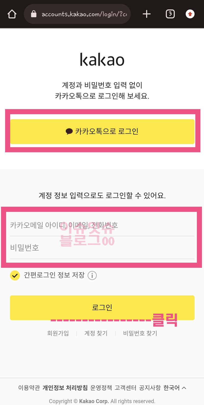버튼을 누르면 카카오톡 로그인하라고 나온다. 당연히 카카오톡 로그인을 해야 나라는 것을 알 수 있으니 로그인을 한다.